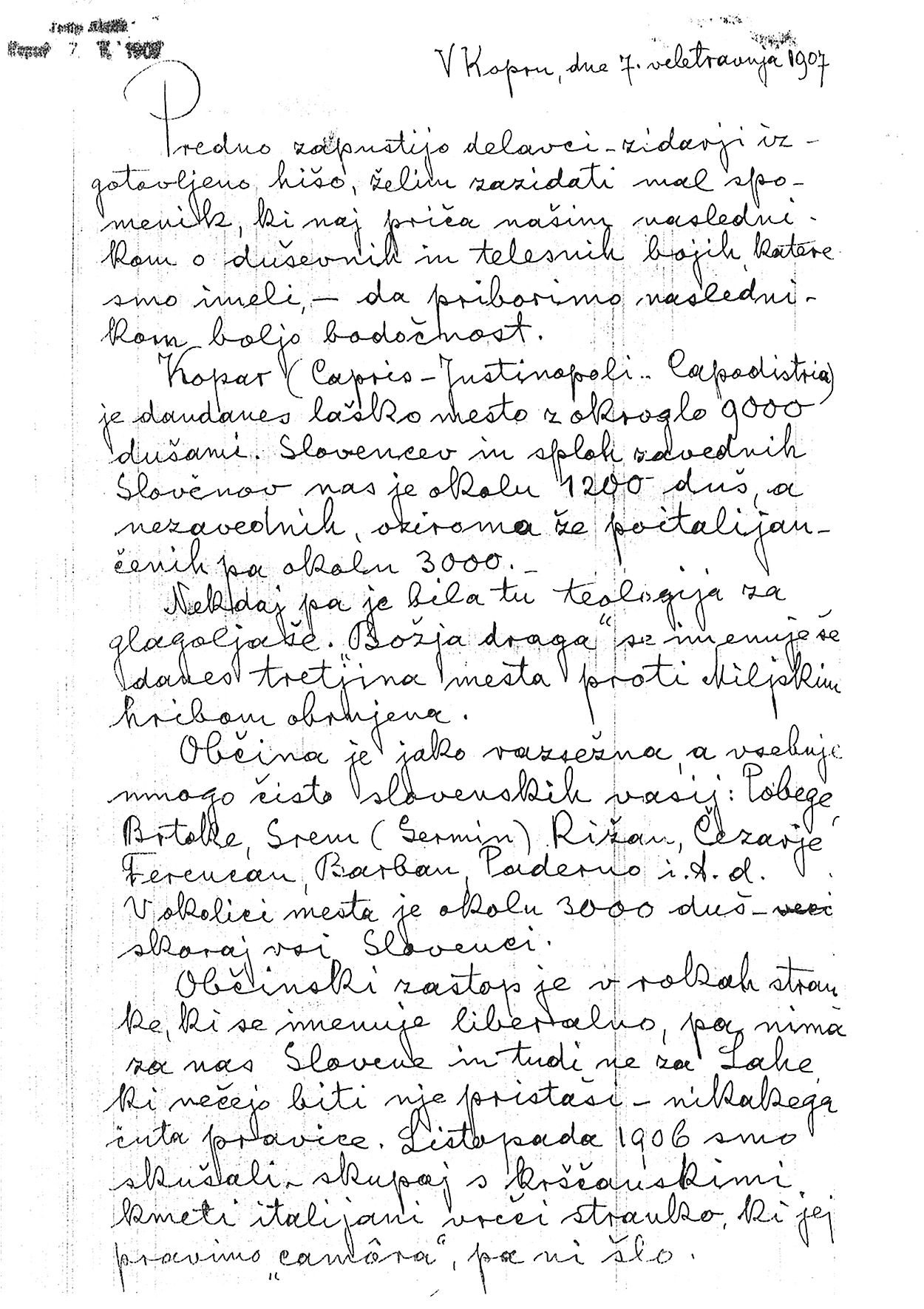 “Preden zapustijo delavci zidarji izgotovljeno hišo, želim zazidati mal spomenik, ki naj priča našim naslednikom o duševnih in telesnih bojih, katere smo imeli, - da priborimo naslednikom boljo bodočnost,” je 7. maja 1907 svoje pismo začel Koprčan Josip Ahtik.